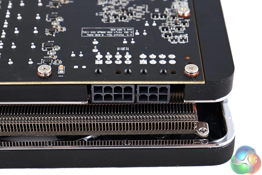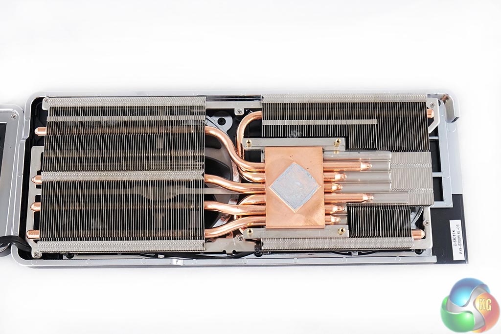 The cooler is removed easily, exposing the PCB underneath – which is passively cooled by some heatsinks in key positions. The cooler itself is formed around a substantial copper base with 6 heatpipes. These heatpipes run straight into a rack of aluminum fins on one side. Two of them bend backwards into another, smaller, completely separate heatsink.