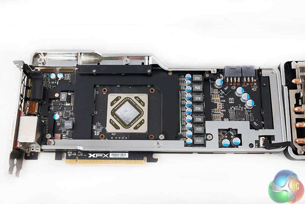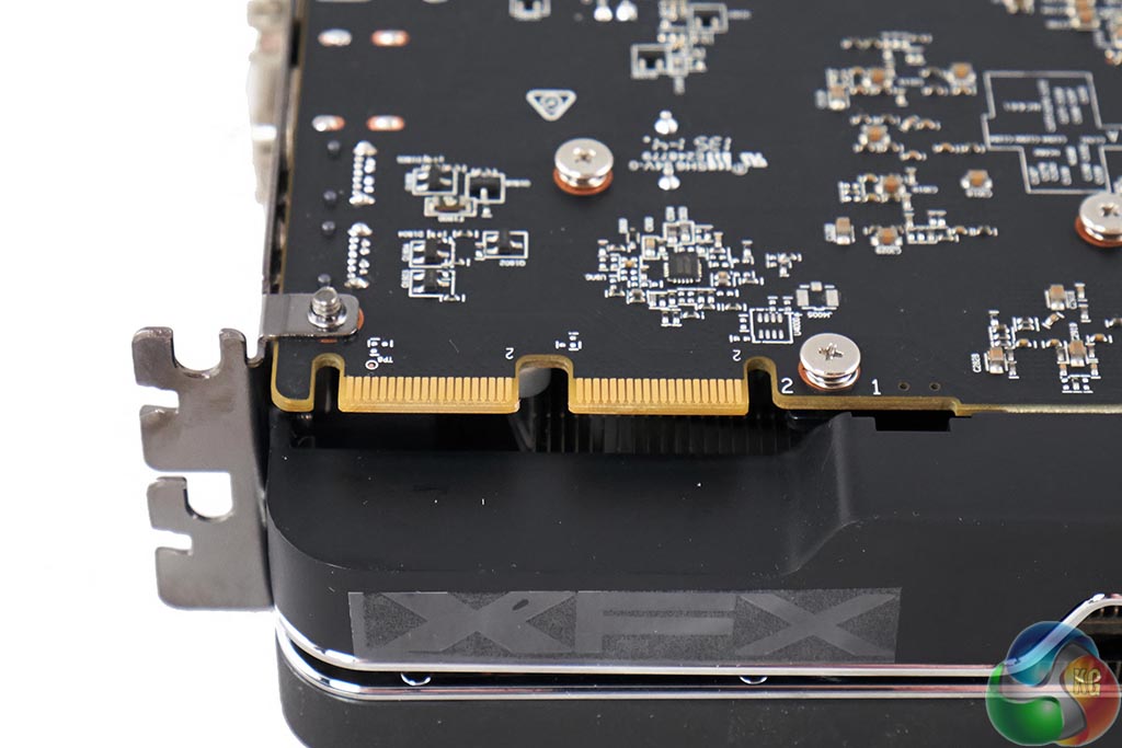 This is certainly an eyecatching card. The matt black colour of the colour is enhanced with the silver/chrome style edges and red stickers on the fans. XFX have ensured the black PCB matches the overall appearance.