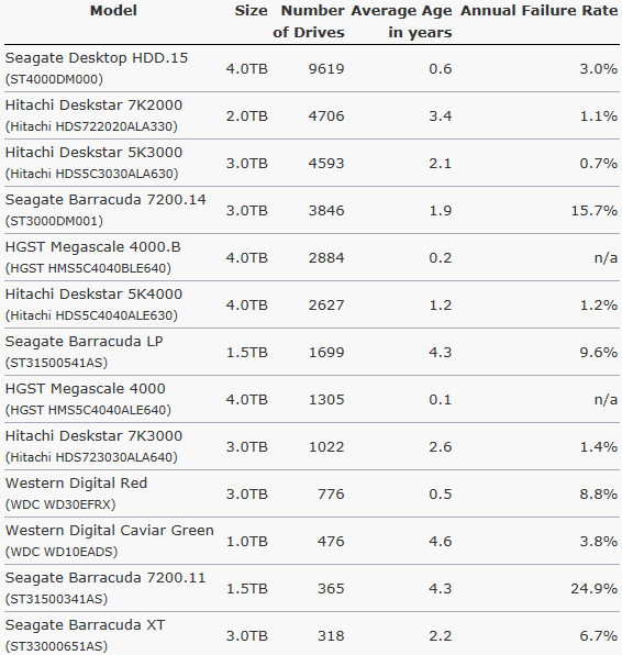 But the general trend is correct where Seagate is worse , while WD is middle ground (about twice better in reliability) and HDS the best at twice better than WD. This was covered in a Google report I have seen a couple of years back where they surveyed way more than 10K disk of each type over the similar age range aggregate and the failure rate per year.