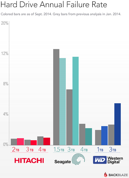 The Western Digital 3TB drives have also became less reliable at Backblaze. Failure rate of the WD 3TB drives went up from 4 per cent to 7 per cent, according to figures provided by the company.