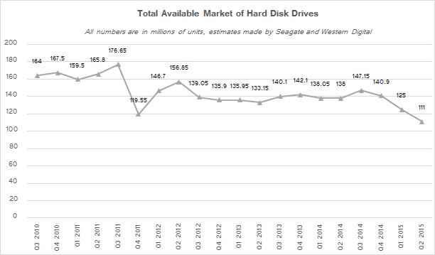 Total available market of hard disk drives dropped to 125 million units in Q1 2015 and to 111 million units in Q2 2015, according to estimates by Seagate and Western Digital. By contrast, despite of dropping demand for PCs, sales of SSDs for client PCs in Q1 2015 grew by 3.5 per cent quarter-over-quarter, according to TrendFocus. Sales of all SSDs in the second quarter of 2015 increased by 2.9 per cent QoQ and totaled 23.859 million units.
