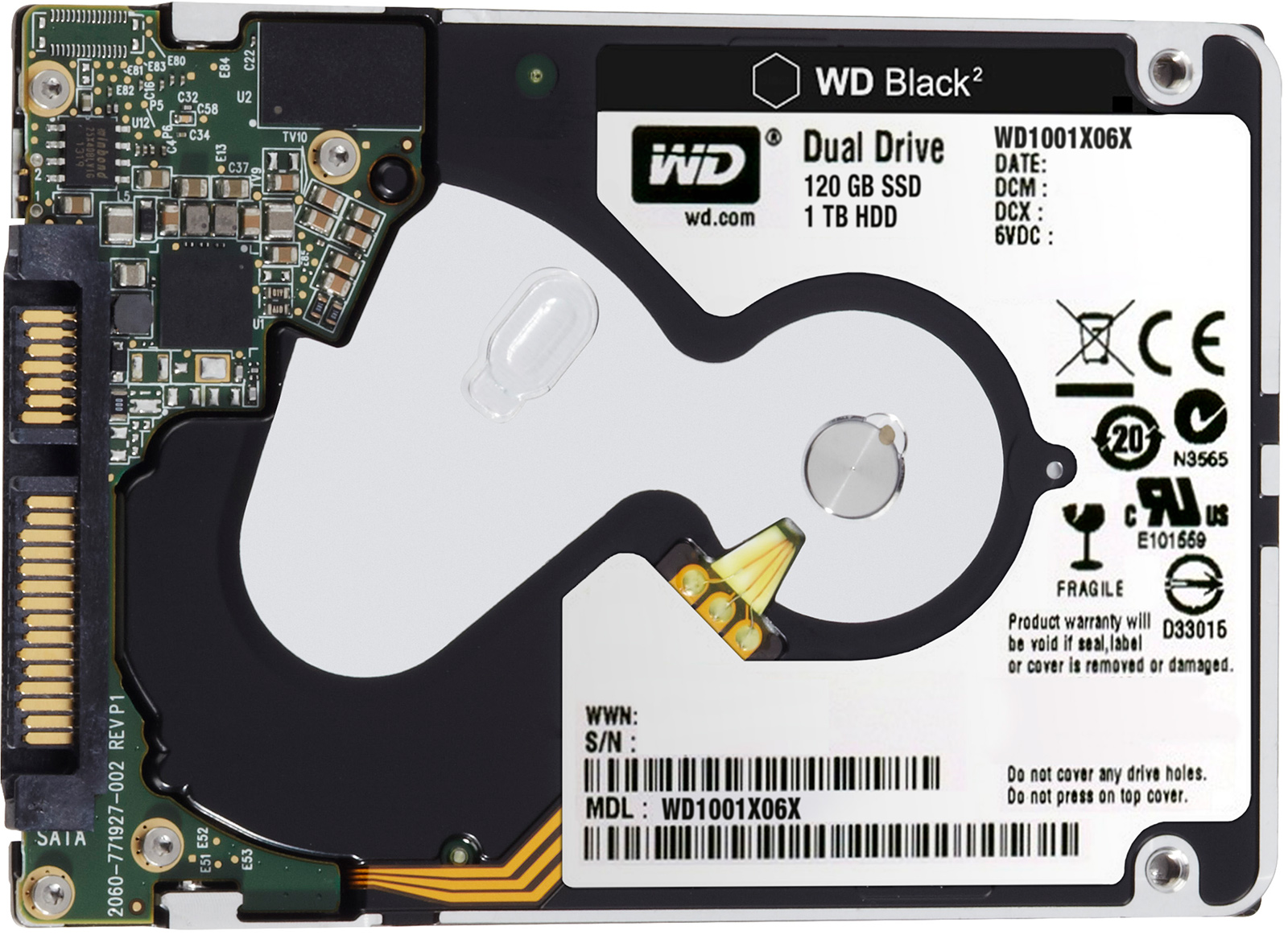 At present WD offers only one hybrid storage solution, the WD Black², which did not get a lot of good reviews. The WD Black2 is essentially a 1TB hard drive and a 120GB solid-state drive in one 2.5”/9.5mm form-factor package. The drive connects to the host controller using a single Serial ATA-6Gb/s interface and appears as one storage device with two partitions. The SSD of the WD Black² provides up to 350MB/s read and up to 140MB/s write speed, which is very low performance level by today’s SSD standards. While the Black² is not a performance champ, it costs quite a lot ($209 in the U.S., £158 in the U.K.).