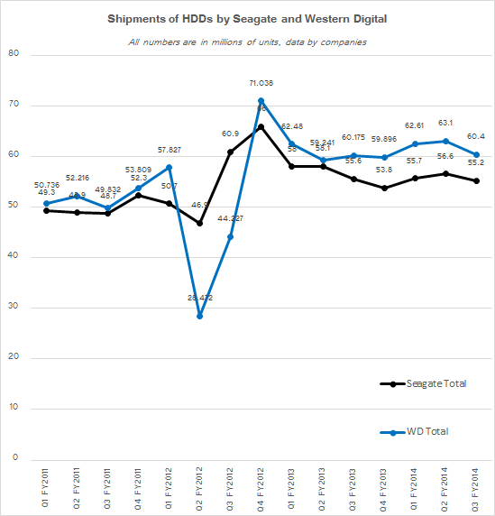 During the first quarter of 2014 (which corresponds to the third quarter of WD’s and Seagate’s fiscal years) WD sold 60.4 million of hard disk drives for various applications. Average selling price of a Western Digital HDD was $58. By contrast, Seagate supplied 55.2 million of hard disk drive units during the same period, ASP of a Seagate drive was $61.