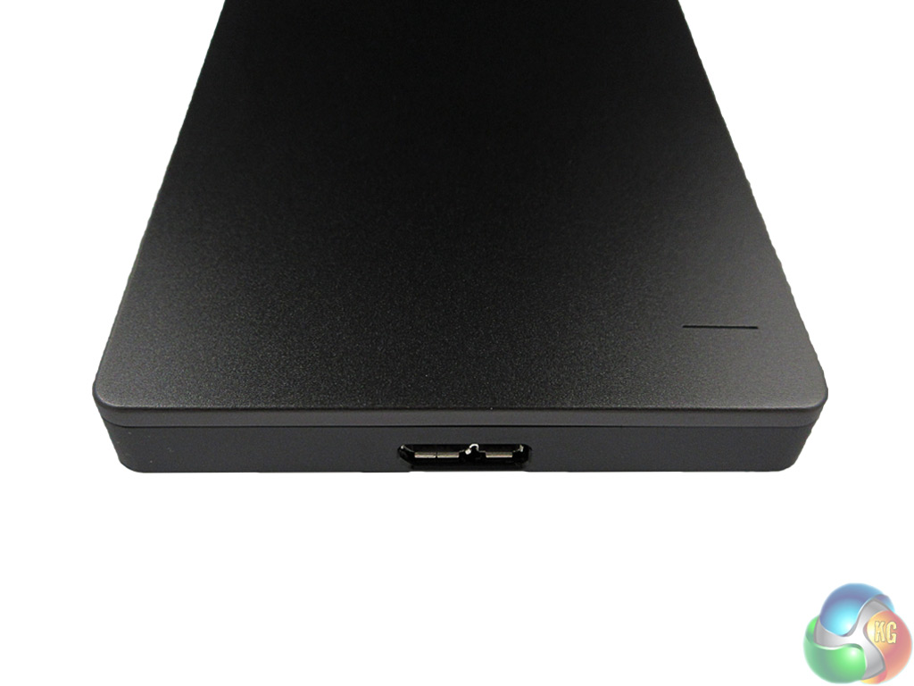 At the top edge is the microUSB 3.0 port; the supplied 18-inch cable connects from there to your standard USB port on your laptop/desktop. My one qualm here would be that the cable itself could be a bit longer just to provide extra ease-of-use for desktop users, but for laptops it should be fine.