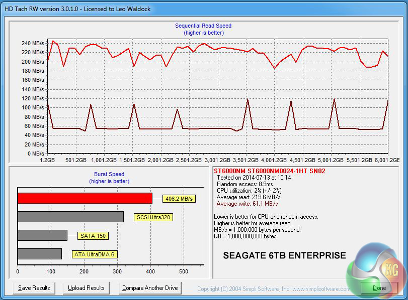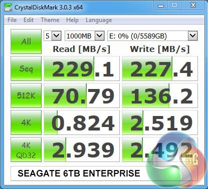 Testing the Seagate Enterprise v4 6TB as a regular SATA drive was an eye opening experience. As you can see from HD Tach and CrystalDiskMark this is a fast drive, and more to the point it is consistently fast. HD Tach agrees with Seagate's claimed speed and delivers a figure of 219.6MB/sec and CrystalDiskMark is slightly faster.