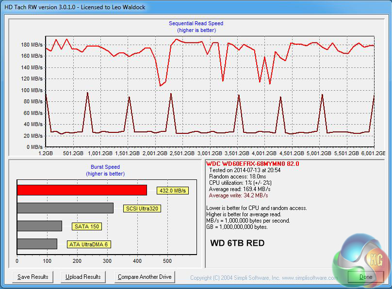 In HD Tach the Western Digital Red does surprisingly well for a drive with a slow spin speed. The Read figure of 169.4MB/sec is around 80 percent of the Seagate and Toshiba and the burst speed of 432.0MB/sec is very similar to the other two drives. When it comes to write speeds the Western Digital Red suffers as 34.2MB/sec figure is around half the other drives. While that looks bad the fact is that NAS drives need to be able to serve files swiftly and it isn't the end of the world if it takes a while to uploads files to the NAS.