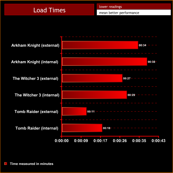 Now let's take a quick look at loading times. For this graph I measured how long it took to load up several games on the internal HDD VS Seagate's external Game Drive. I chose three games to test and loaded up the exact same save file each time in order to keep the test fair. I also ran each game a few times to account for any margin of error or abnormal results.