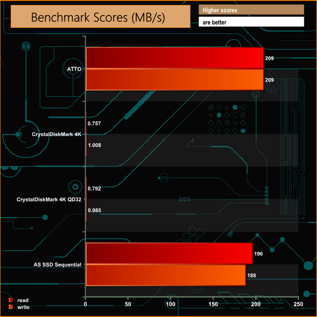AS SSD is a great free tool designed just for benching Solid State Drives. It performs an array of sequential read and write tests, as well as random read and write tests with sequential access times over a portion of the drive. AS SSD includes a sub suite of benchmarks with various file pattern algorithms but this is difficult in trying to judge accurate performance figures.