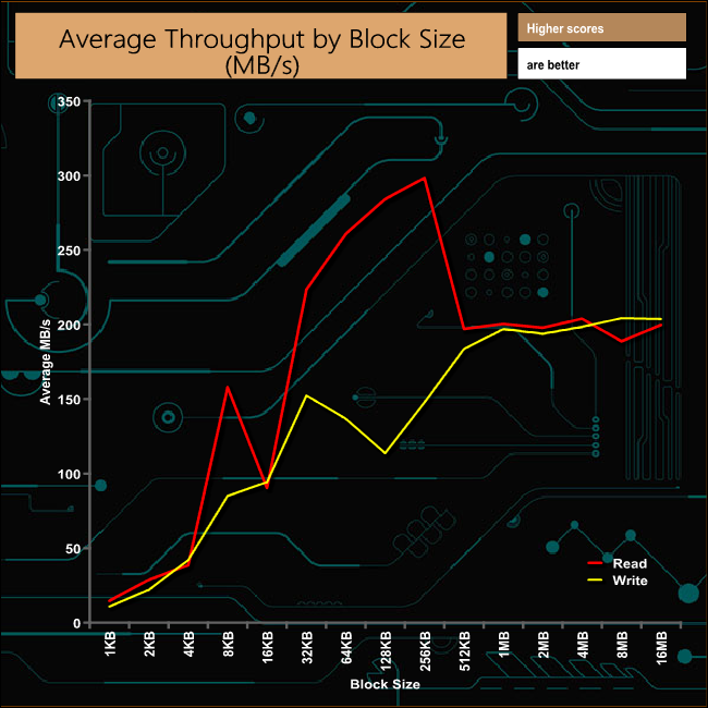 In our throughput test, reads peaked at 298.23MB/s before dropping back to just under the 200MB/s mark. Writes on the other hand peaked at just 204.25MB/s.
