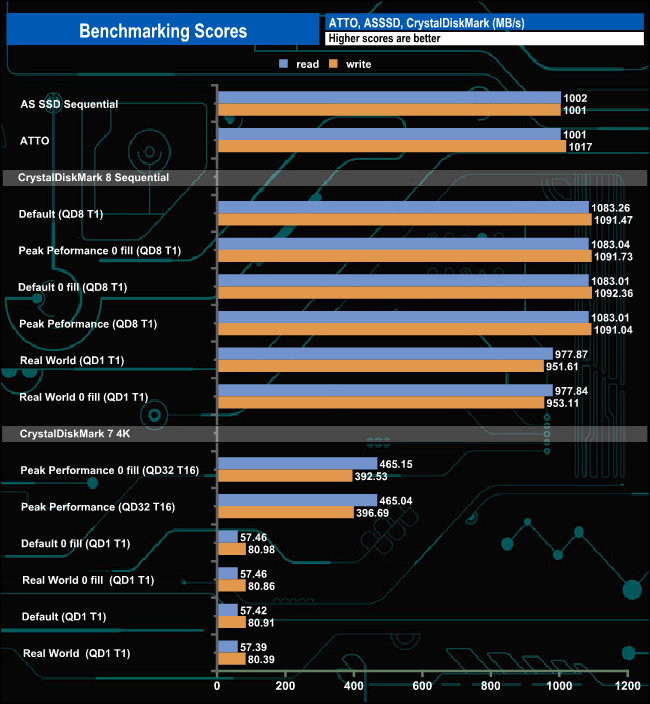 Although the review drive came bundled with a PCIe Gen3 drive in the shape of a WD Blue SN570 drive, the enclosure also supports Gen4 drives so we did some retesting using a 1TB Samsung SSD980 PRO. Switching over to the Gen4 drive saw both the ATTO and AS SSD Sequential test result figures rise from 848MB/s (reads) and 936MB/s (writes) to 1,001MB/s and 1,017MB/s for read and writes respectively using ATTO. AS SSD figures rose from 959MB/s (reads) and 915MB/s (writes) up to 1,002MB/s for reads and 1,001MB/s for writes.