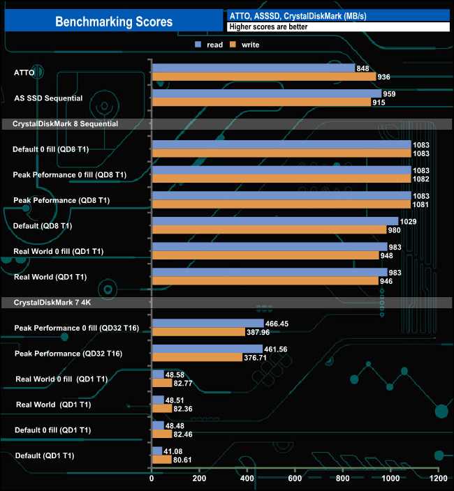 AS SSD is a great free tool designed just for benching Solid State Drives. It performs an array of sequential read-and-write tests, as well as random read-and-write tests with sequential access times over a portion of the drive. AS SSD includes a sub suite of benchmarks with various file pattern algorithms but this is difficult in trying to judge accurate performance figures.