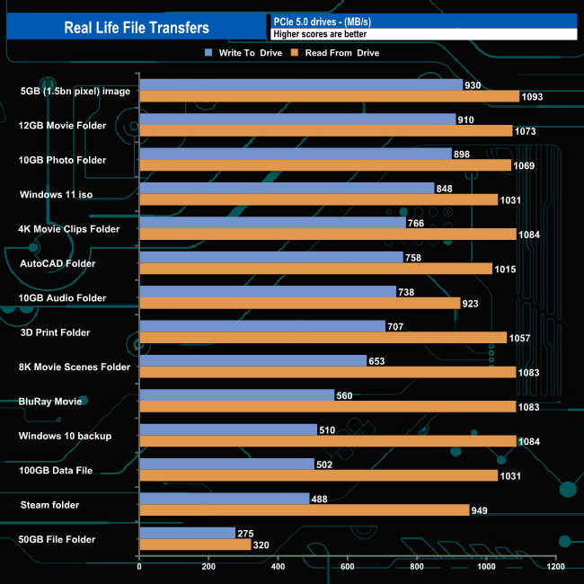 When it came to our real-life transfer tests the WD Blue SN570 averaged 641.64MB/s when writing the data to the drive, the fastest transfer being the 5GB image at 930MB/s. Reading the data back the drive averaged 992MB/s with the 5GB image transfer again the fastest at 1,093MB/s.