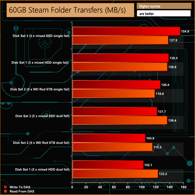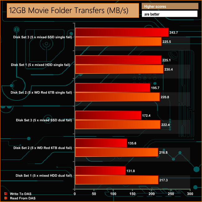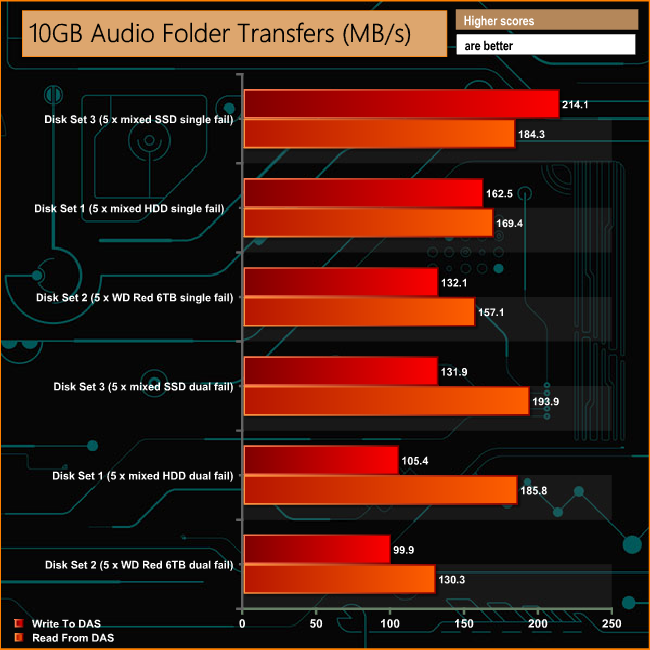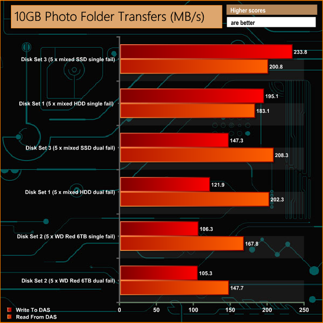 The Drobo 5C handles the Real Life file transfer tests without missing a beat, with over 100MB/s performance across the arrays for nearly all the tests.