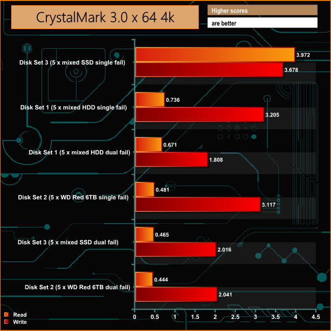 It comes as no surprise to see the group of SSDs at the top of the 4K graph. They overshadow all the other disks in both read and writes although the read performance does take a hit when the drives are in a dual disk failure mode.