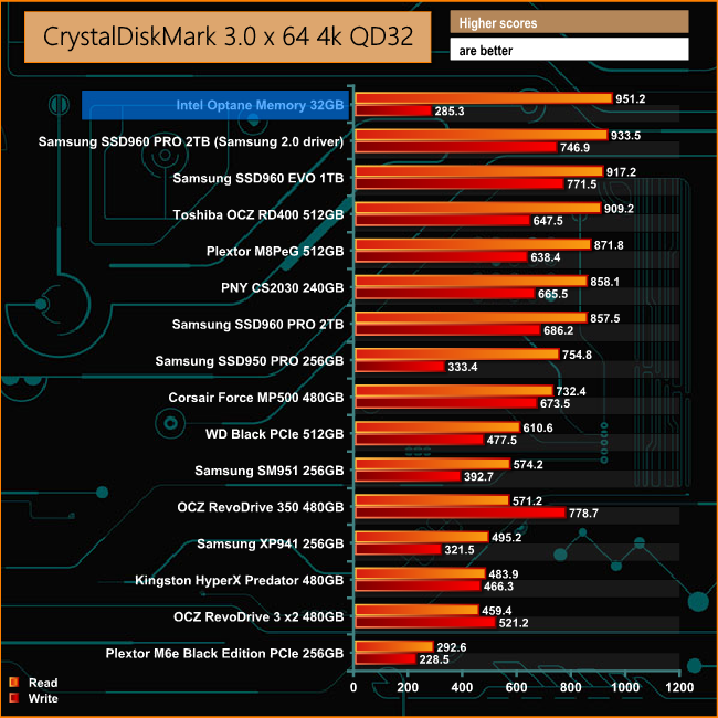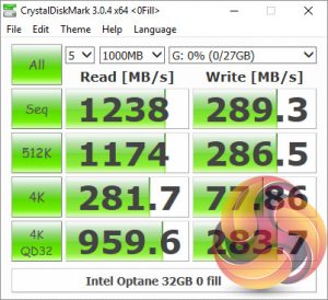 When dealing with small files at a fairly deep queue depth, the Intel Optane memory module excels when it comes to read performance, going straight to the top of our chart, producing 951.2MB/s in the default CrystalDiskMark test. As can be seen from the benchmark result screens, the controller has no real preference when it comes to dealing with data.