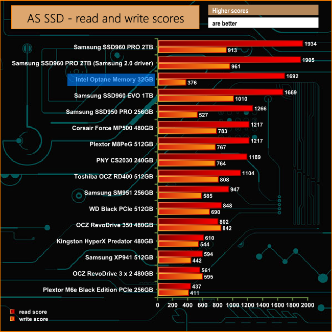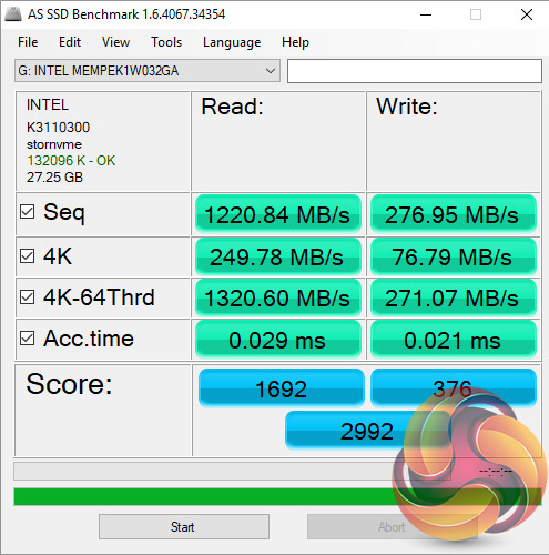 In the AS SSD benchmark, the read performance of the 32GB Optane Memory module is very impressive, slotting in between the two Samsung SSD960 drives we have tested. It sits a fair way back from the Samsung SSD960 Pro but just manages to beat the SSD960 EVO. Write performance, however, is a completely different story. It's score of 376 is the lowest we have seen for a PCIe interfaced drive.