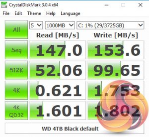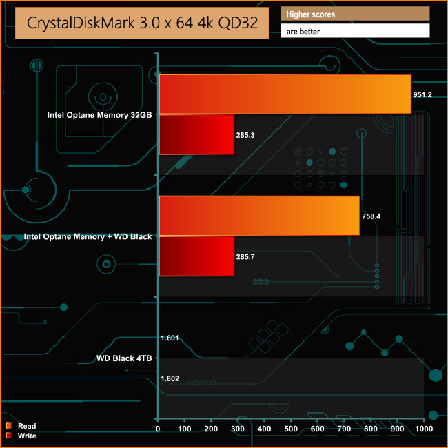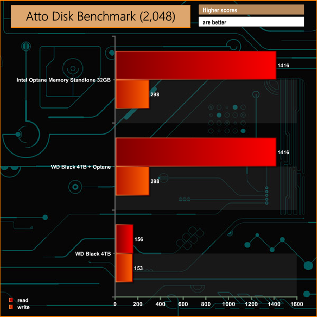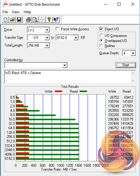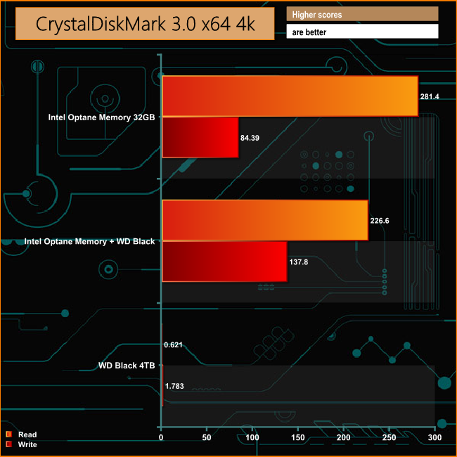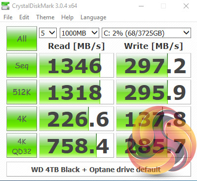 For a mechanical drive, WD's 4TB Black drive is a pretty quick disk on its own, but by combining it with Intel's Optane Memory module, the Sequential read performance of the Black is taken to a whole new level. It rockets from 156MB/s to 1,416MB/s and while the Sequential write performance sees nowhere near the same gains, it does almost double the stand-alone HDD's score.
