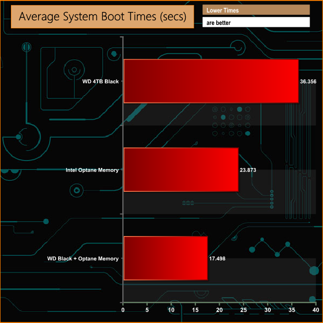The combined WD Black/Optane Memory module halves the boot time of the WD Black on its own. The time drops from 36 seconds for the HDD drive to 17 seconds for the combination of the two.