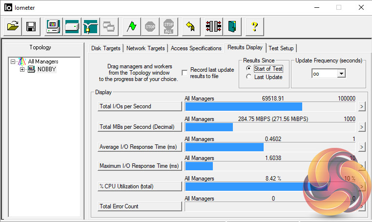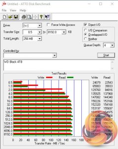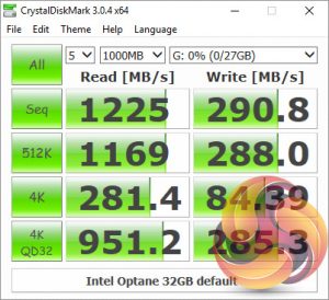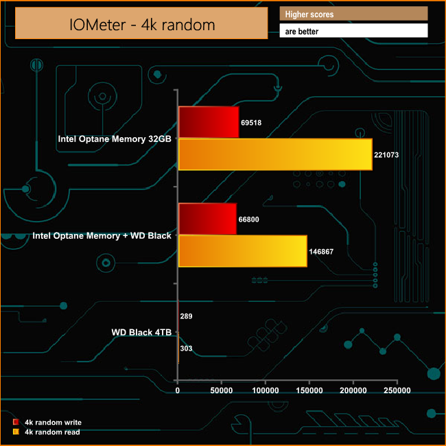 The huge boost in performance for the WD Black drive when combined with the Optane Memory module continues when looking at the 4K Random IOPS test. Random reads go from 303 IOPS for the WD Black on its own up to 146,867 IOPS when combined, while Random writes shoot up from 289 IOPS to 66,800 IOPS.