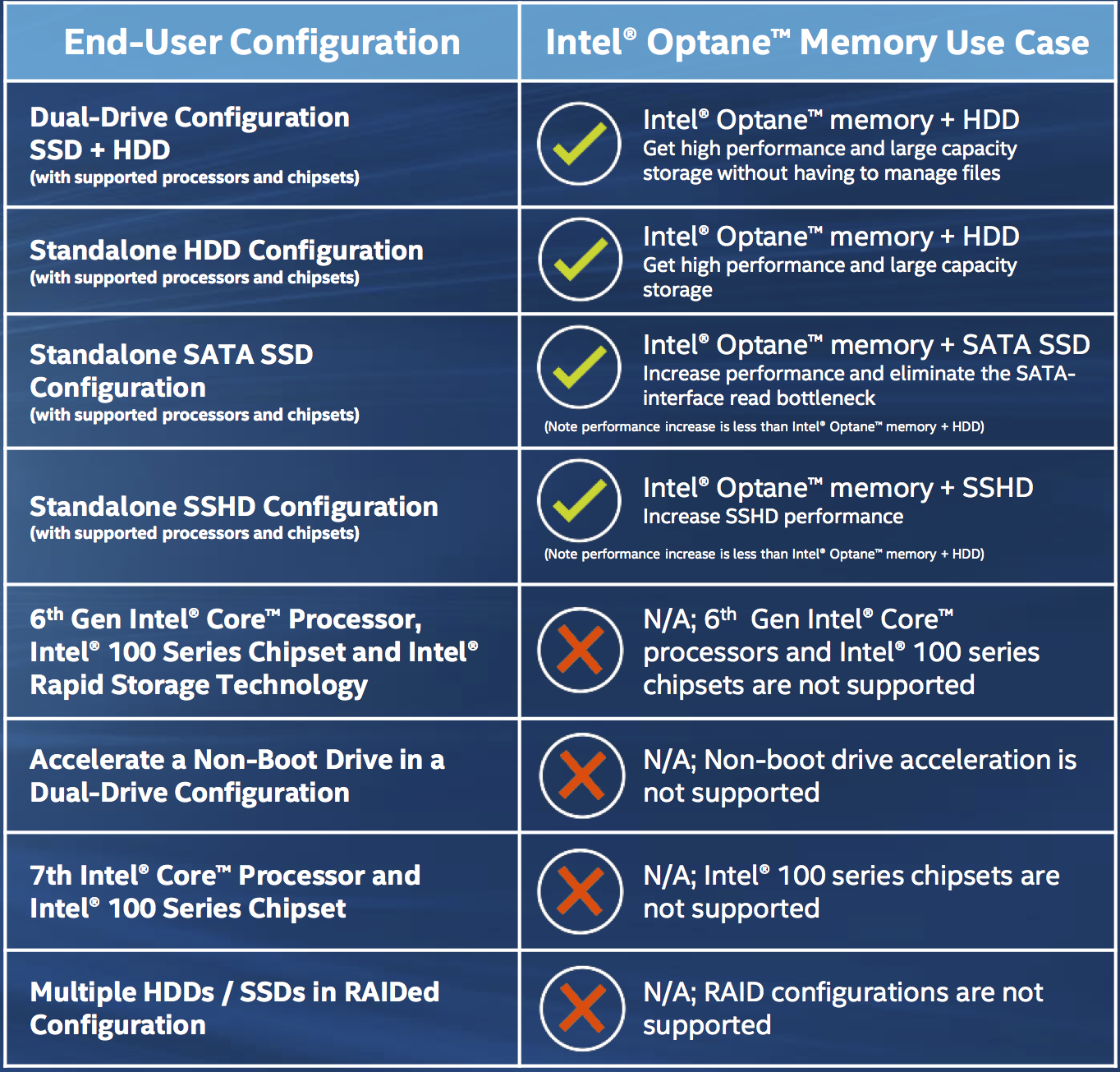 The major fly in the ointment with the Optane Memory module is the official restrictions it currently comes with, which will be a limiting factor on its use. It only supports Kaby Lake processors and then only Core i7, i5 and i3 parts. There's no current support for the latest Celeron and Pentium CPUs and when it comes to chipsets it's the 200 series or nothing for mainstream boards and HM175, QM175 or CM238 for mobiles. Oh yes, and Windows 10 64-bit only.