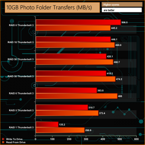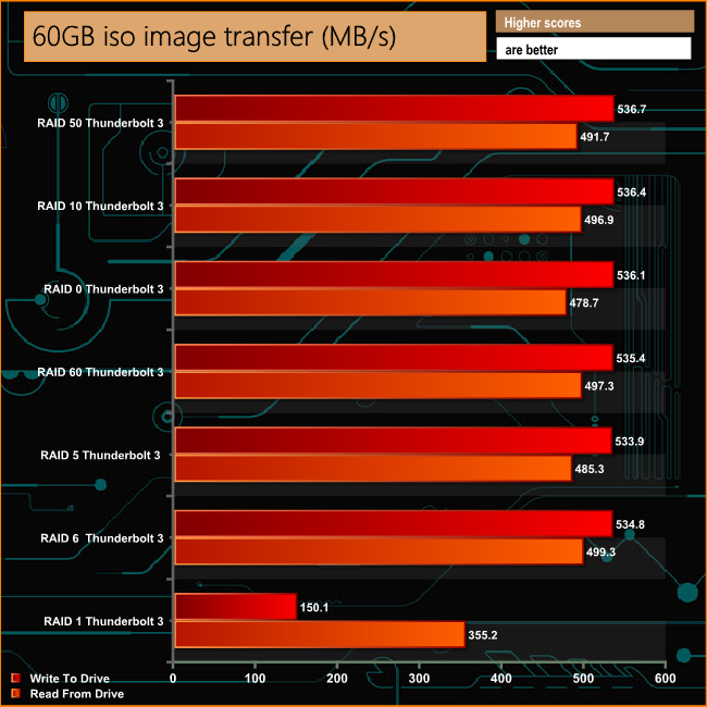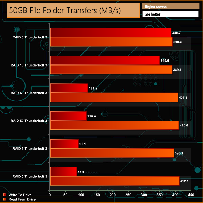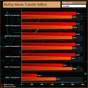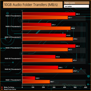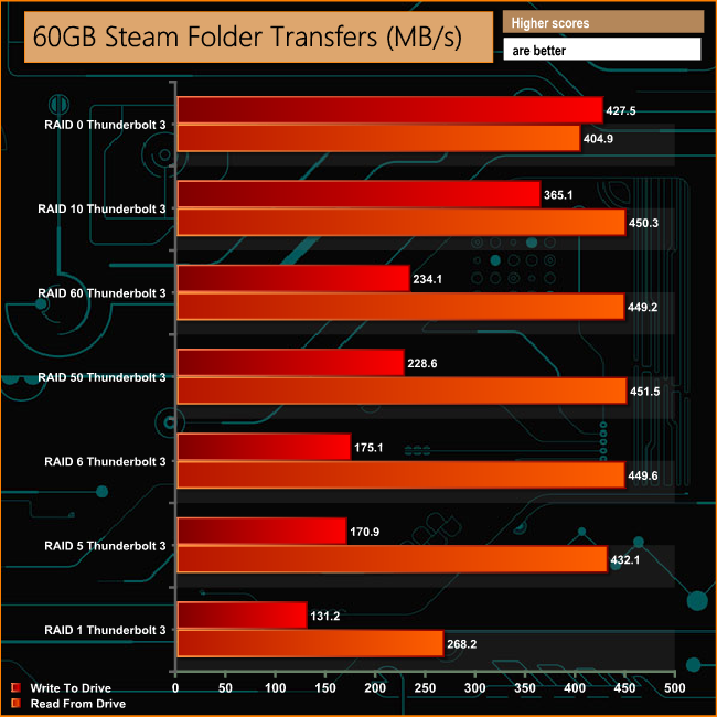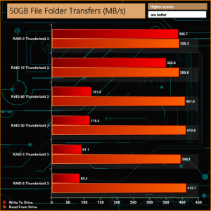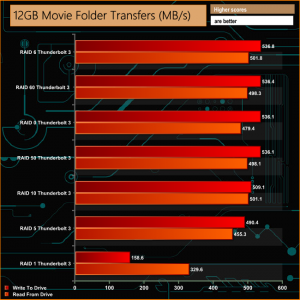 Taking the two disk RAID 1 setup out of the equation, the 12big has no problems dealing with the 60GB iso file, writing to the drive at an average of 535.55MB/s and reading back at an average of 491.5MB/s. It's not as happy when the small bity contents of both the 50GB File and the 60GB Steam folders are written to the drive but the performance bounces back with the larger file sizes of the mulitmedia folders.