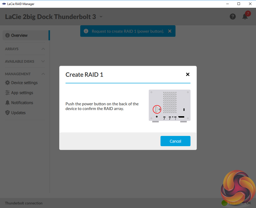 It also displays how much of drives capacity will be used, in the case of RAID 1, for Mirroring and Parity duties. Once you have selected which RAID version you want, oddly you have to press the power button in the rear panel to create the array.