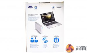The rear of the box has an image of how the drive can be used with a laptop with a multilingual description of Thunderbird 3 transfer speeds. Below the image are three icons showing Thunderbolt Daisy Chaining, USB-C connectivity and USB 3.0 compatibility.