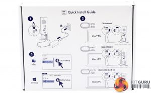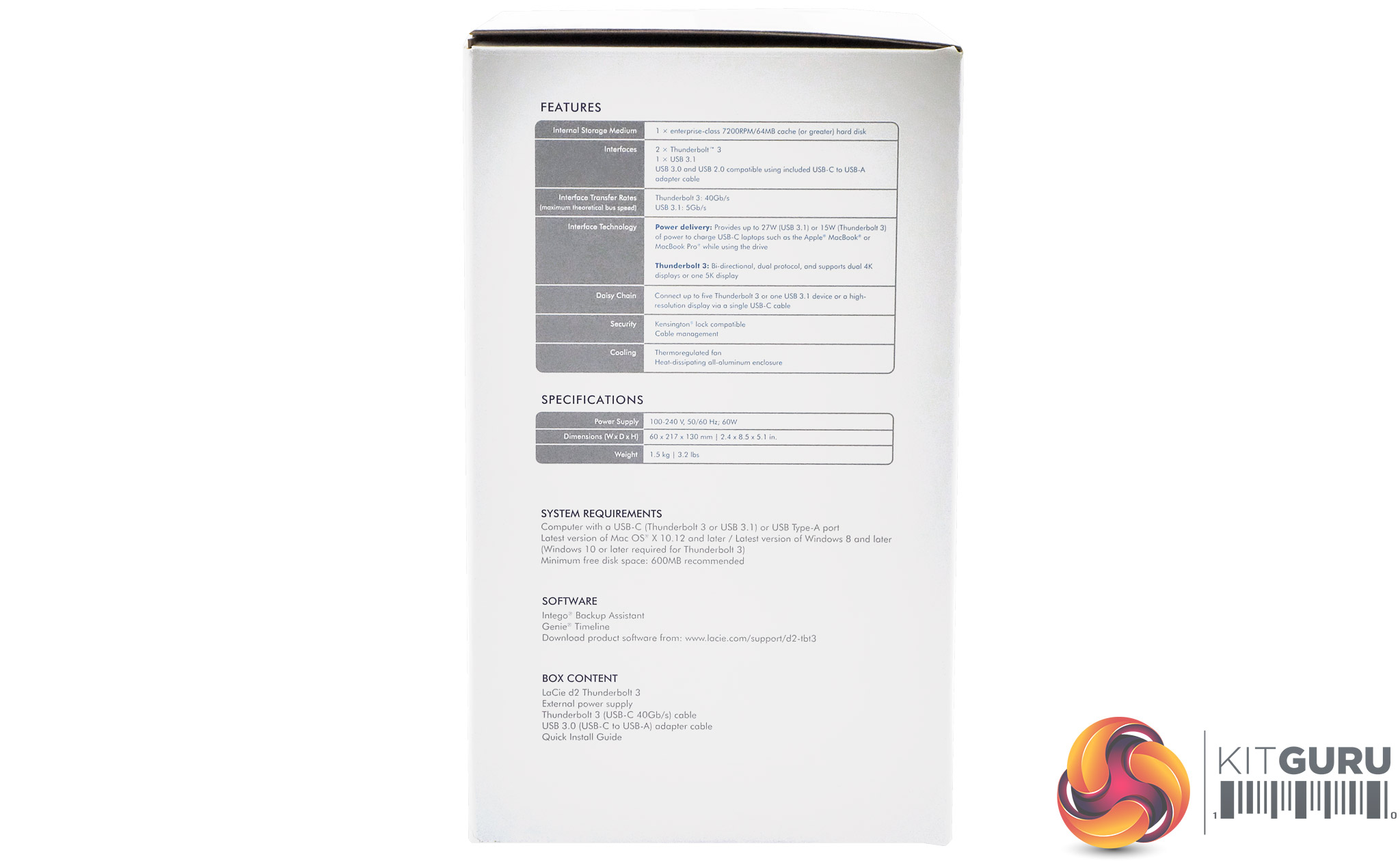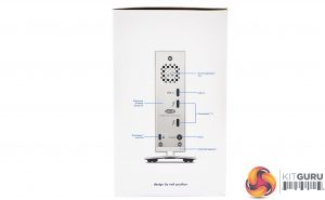 One side of the box has an image of the rear of the drive showing all the various ports and an acknowledgement that is has been designed by Neil Poulton. The other side panel has a feature table, a small specifications table and lists of system requirements, software and what's in the box.