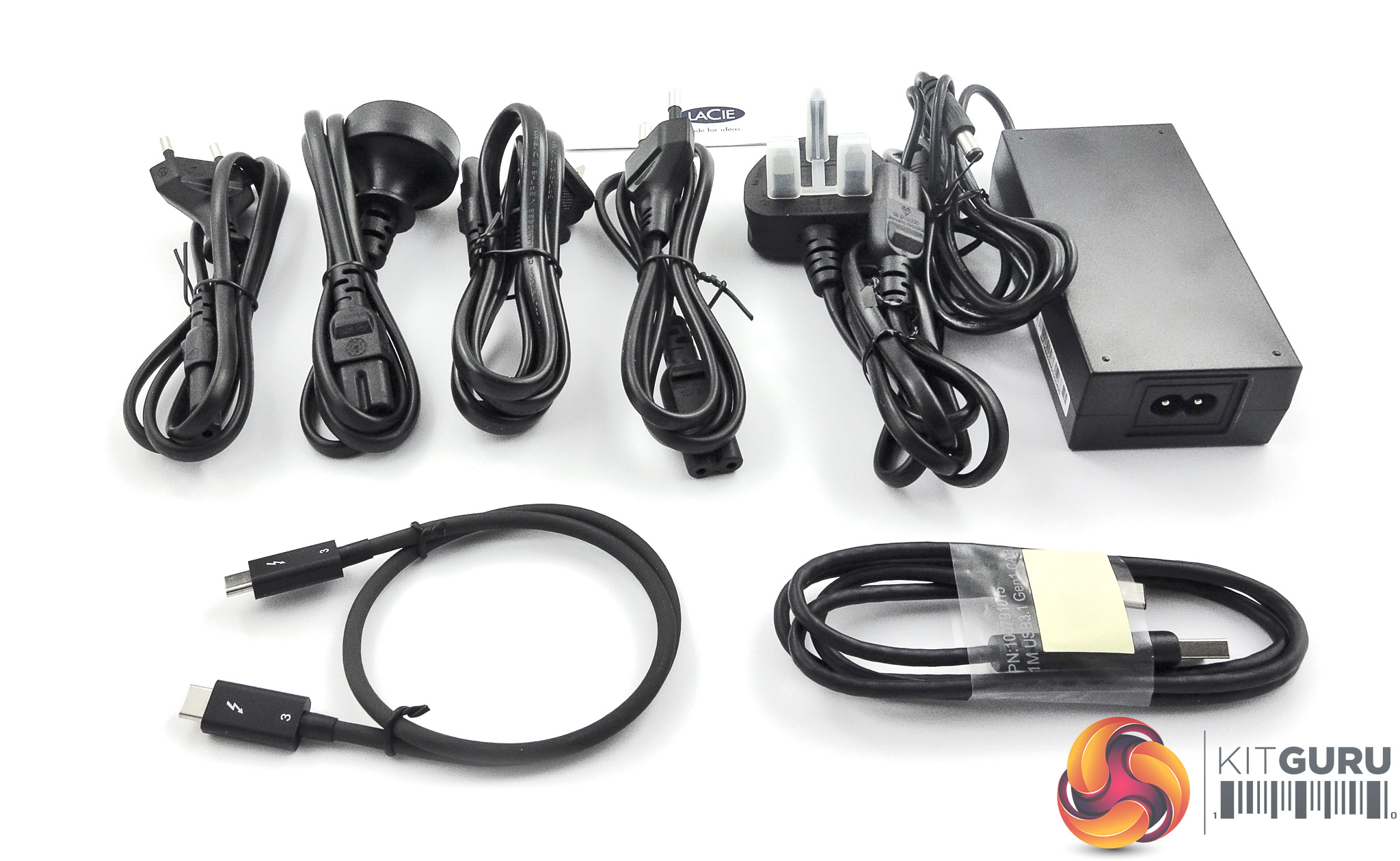 The outside of the accessory box has an illustrated quick start guide showing how the d2 drive can be connected while inside the box there seems to be every mains connector known to man to connect to the 60W power adapter to any national grid, a USB-C cable and finally a Thunderbolt cable.