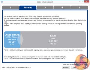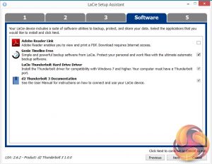 LaCie's Setup Assistant utility comes pre-loaded on the drive. With it, you can partition the drive to be used by a Windows or Mac system or even make two partitions to accommodate both systems. Also bundled on the drive are a direct link to download Adobe Reader and LaCie's own Genie Timeline backup software.