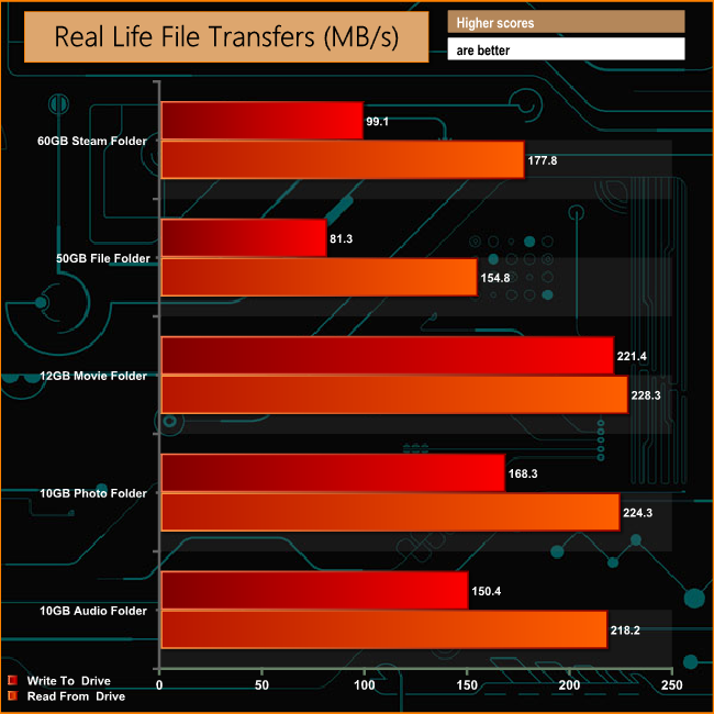 The only times the drive's performance dropped below 100MB/s in the real life file transfer tests were when it was writing the small bity files of the 50GB File folder and the 60GB Steam folder.