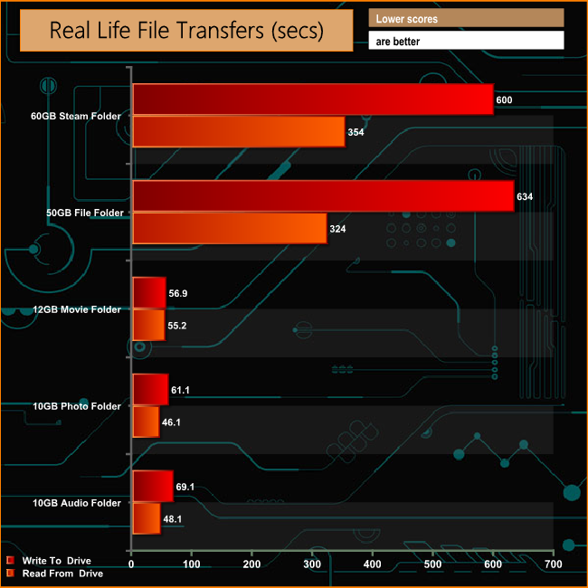 The dip in performance of writing the contents of the 50GB file folder and the 60GB Steam folder is shown up in the times both activities took to complete, the 50GB folder took ten minutes and the 60GB Steam folder ten and a half minutes.