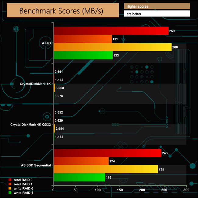 The official transfer rate for the pair of Seagate 2TB drives in the Rugged RAID PRO is 140MB/s each. In RAID 0 the drives in our review unit produced 259MB/s for reads (129.5MB/s per drive) and 266MB/s (133MB/s per drive) for writes when tested with the ATTO benchmark.