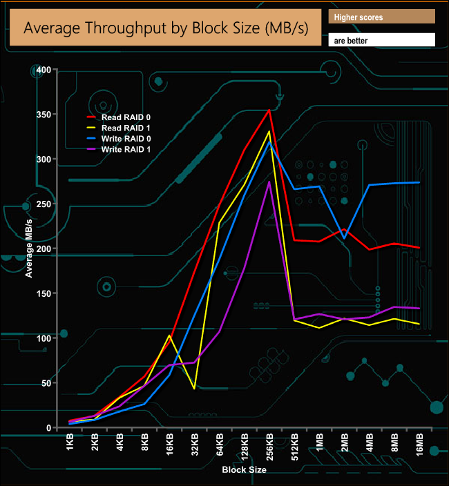 In our throughput test, the peak read performance came when the drives in the Rugged RAID PRO were built in a RAID 0 array at 354MB/s at the 256KB block size before dropping back to finish the test at 200MB/s. Peak write performance in RAID 0 also occurred at the 256KB block at 318MB/s before dropping back to 273MB/s at the end of the test. Peak speeds for reads and writes while in a RAID 1 mode were 330MB/s and 274MB/s respectively.
