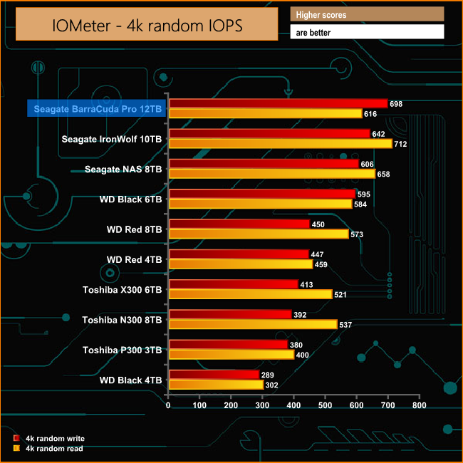 With a 4K Random Write IOPS figure of 698, the 12TB BarraCuda Pro is the fastest hard drive we've tested to date when it comes to writes. However when it comes to random reads, the drive slips behind Seagate's 10TB IronWolf and 8TB NAS drives.