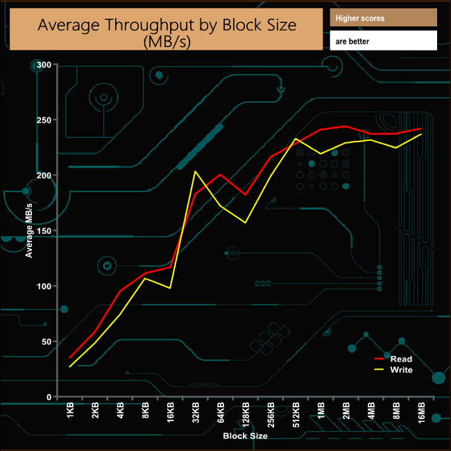 Peak read throughput performance comes at the end of the test at the 16MB block level with the drive topping out at 242.07MB/s. Write performance tops out a little lower at 236.90MB/s.