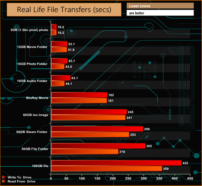 The drive produced pretty strong read/write performance when it came to dealing with our real life files. It averaged 241.5MB/s for reads over the 9 tests and 215.25MB/s for writes.