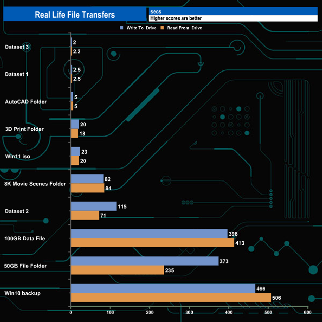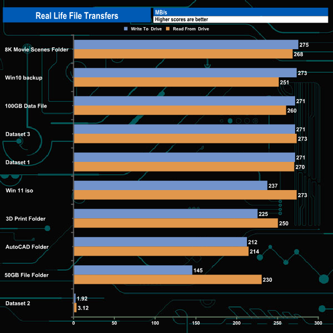 To test the real-life performance of a drive, we use a mix of folder/file types and by using the FastCopy utility (which gives a time as well as MB/s result) we record the performance of drive reading from & writing to a 2TB Koxia Exceria Plus.