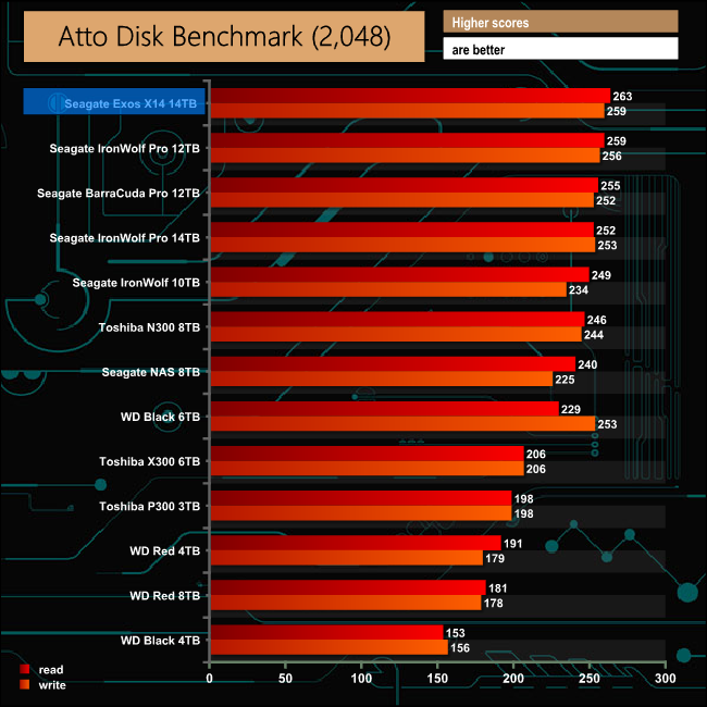 The official transfer rate figure for the 14TB Exos X14 is up to 261MB/s which can be confirmed with the ATTO benchmark. The tested drive produced figures of 263MB/s for reads and 259MB/s for writes.
