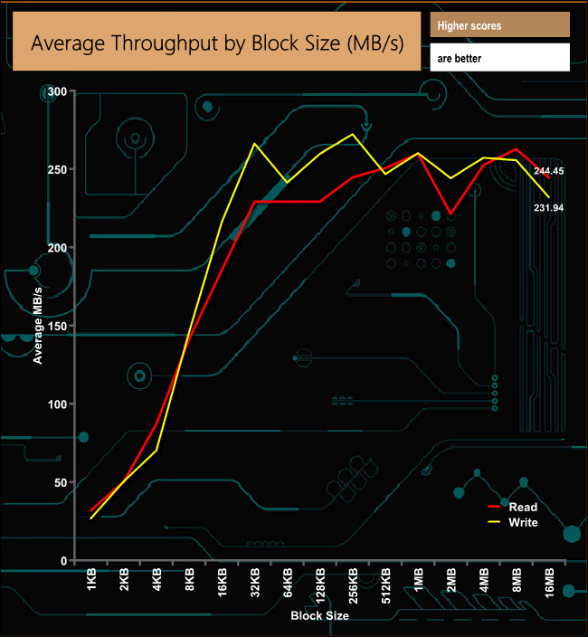 In our throughput test, reads peak at the 8MB block size at 262MB/s before falling back to end the test at 244MB/s. Writes peak at 272MB/s as the drive passes through the 256KB block size, before dropping back to finish the test at 231MB/s. Both of these peak figures confirm the official Seagate transfer rate for the drive of 261MB/s.