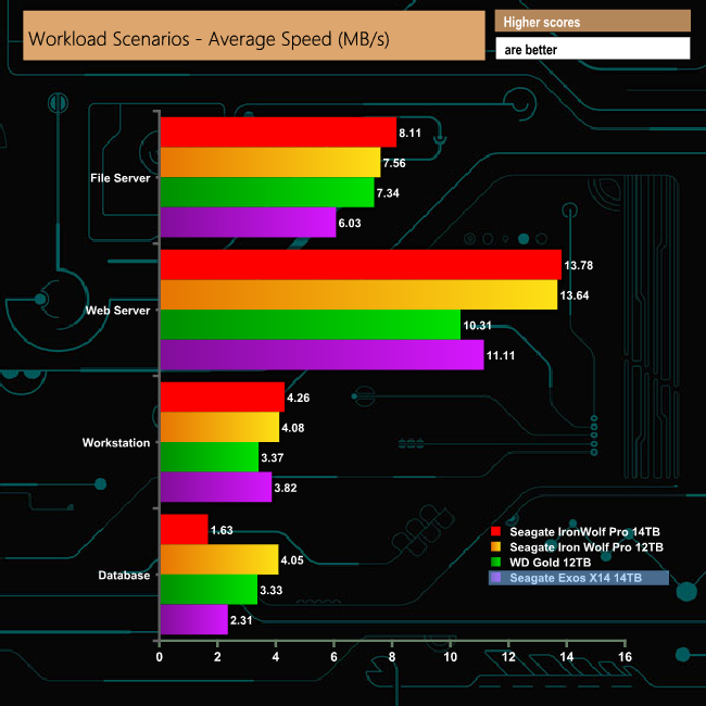 In our workload tests, the Exos X14 isn't as fast as the other 14TB Seagate drive we've recently tested, the IronWolf Pro, with the exception coming in the Database test where the Exos X14 is a good deal quicker.