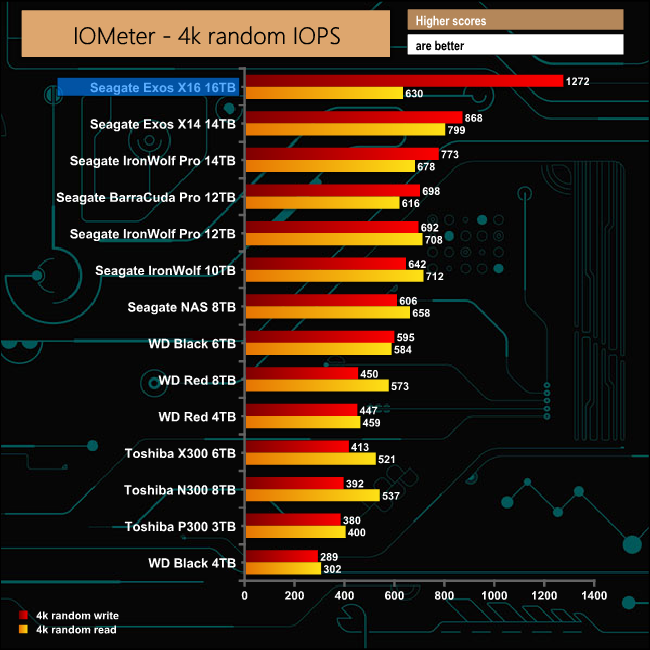 We test with both random read and write 4k tests, as shown above. There are many ways to measure the IOPS performance of a hard drive, so our results will sometimes differ from manufacturer’s quoted ratings. We do test all drives in exactly the same way, so the results are directly comparable.