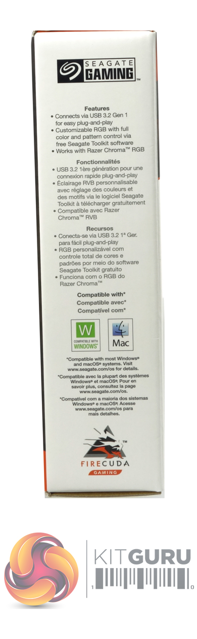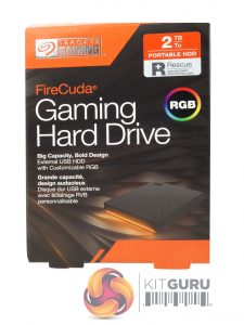 The FireCuda Gaming Hard Drive comes in a sturdy box with an image of the drive on the front along with a logo informing that it has RGB lighting. On the top right-hand side of the box is a sticker with the drives capacity and the fact it comes with Seagate's Rescue Data Recovery service.