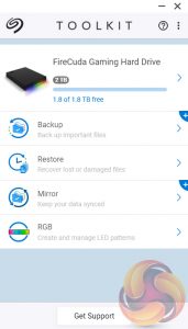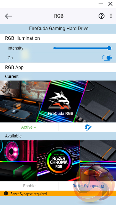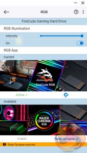 The drives FireCuda RGB function is controlled by two pages in Toolkit and at first glance, there doesn't seem much to it but as they say, the devil is in the detail. On the first page, there are options to change the intensity of the lighting or turn it off completely and access to the Razor Chroma support.