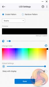 The second page allows for a fairly wide range of tinkering to be done with the RGB. First off there is a choice of two settings; Create Pattern and Rainbow Pattern. The Create Pattern option has four default patterns; Solid (displays single colour), Blink (single colour, 6 sec animation time 50% on,50% off), Breathe (custom animation time, single colour fade) and Spectrum (transitions between 6 colours; red, orange, yellow, green, blue, and violet, with custom animation time).