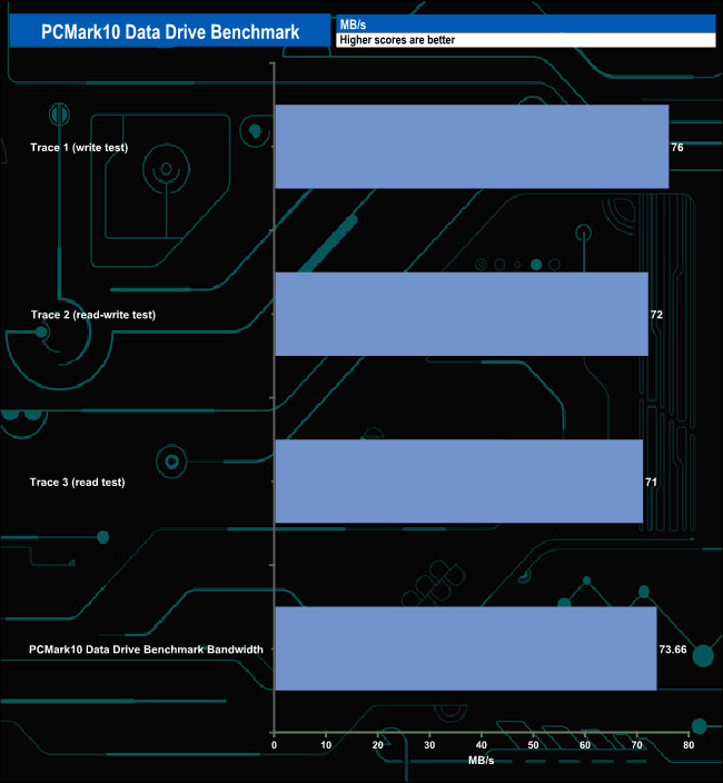 The PCMark 10 Data Drive benchmark figures are what you would expect to see from a 5,400rpm drive, with a best of 76MB/s in the write test.