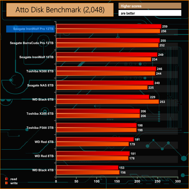 There's no doubting the fact that the 12TB IronWolf Pro is a quick drive. The official maximum sustained transfer rate is quoted as 250MB/s something we could confirm with the ATTO benchmark with reads/writes at 259MB/s and 256MB/s respectively.