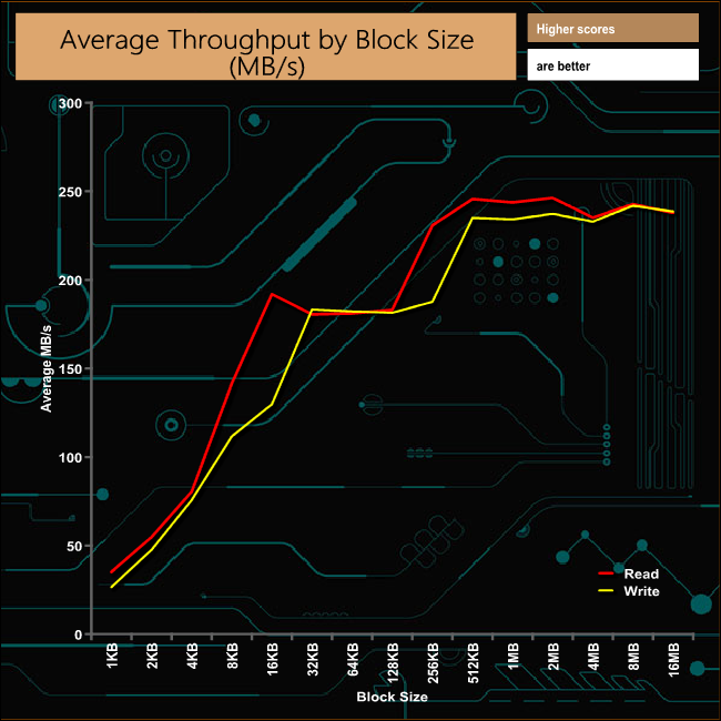 In our throughput test, the drive peaks at 246.32MB/s for reads at a 2MB block size and the peak 241.86MB/s write performance occurs at the 8MB block size.