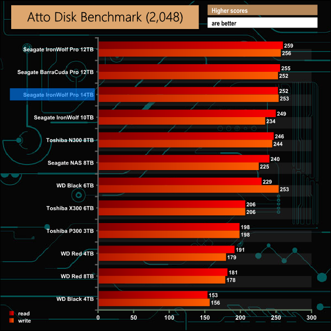 Seagate quote a maximum transfer rate of 250MB/s, a figure we could confirm in the ATTO benchmark. It's not quite as fast as the 12TB BarraCuda Pro and IronWolf Pro drives.