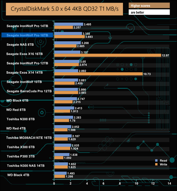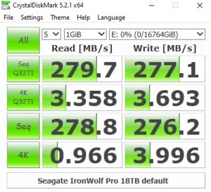 The 18TB Seagate IronWolf Pro is slower than the 14TB version of the drive when it comes to reads in the QD32 CrystalDiskMark test but the new drive has a much better write performance.